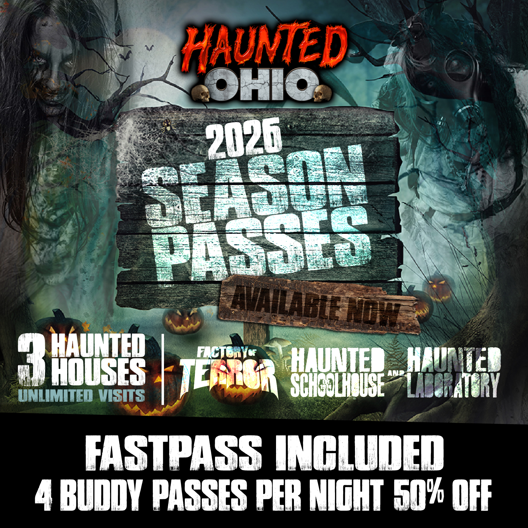 The Haunted Ohio Season Pass features UNLIMITED VIP FASTPASS access to the FACTORY OF TERROR AND the AKRON HAUNTED SCHOOLHOUSE & LABORATORY. Pass is valid for all off-season events (NOT including the Ohio Christmas Factory) and all regular season events through Dec. 31, 2026.